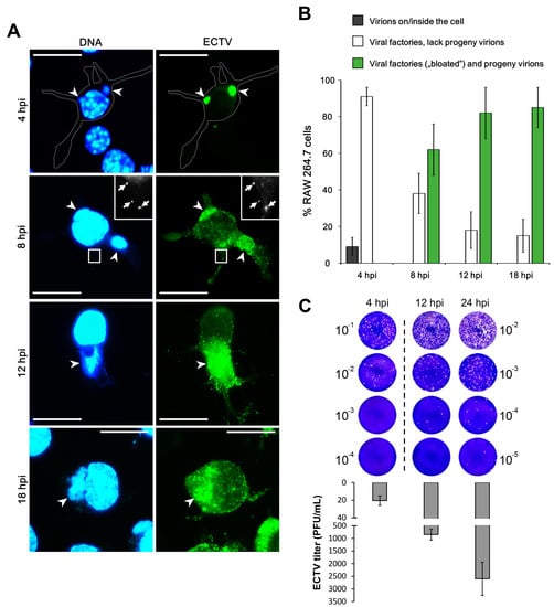 Replication of ectromelia virus (ECTV) in RAW 264.7 cells. (A) Arrowheads indicate the viral factories. Arrows indicate progeny virions. Scale bar: 10 µm. (B) Percentage of ECTV-infected cells with virions on/inside the cell, cells with viral factories without progeny virions, and cells with “bloated” viral factories and progeny virions (n = 100 cells). (C) ECTV titer in RAW 264.7 cells at 4, 12, and 24 hours post infection (hpi) determined by plaque assay. Plaques were visualized by staining infected Vero cell monolayers with 0.3% crystal violet. Data from three independent experiments are presented as mean ± SD. PFU—plaque forming unit.