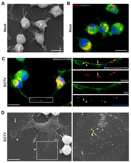 Visualization of morphological changes in ECTV-infected cells was performed using fluorescence staining of F-actin with phalloidin and subsequent fluorescent microscopy and SEM analysis. Infected RAW 264.7 macrophages (Figure 2A,B) strongly adhered to the slide surface (flattened cells), displaying a variety of morphological forms with actin-based cytoplasmic projections, including actin tails (short and thick), filopodia (short/long and thin), and long and wide extensions, referred as “cytoplasmic corridors” (Figure 2C,D) [25,26,27]. Furthermore, cytoplasmic projections contained ECTV particles [23,25] and mitochondria (Figure 2C).