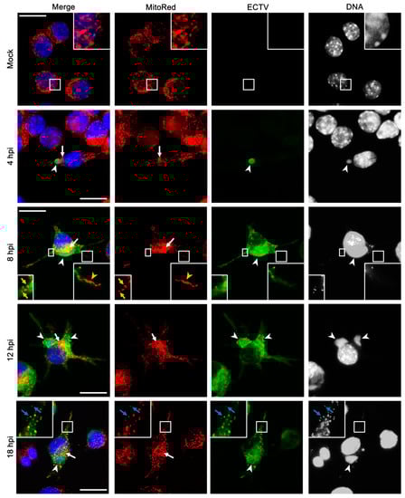 Poxviruses are distinguished from other DNA viruses, as their replication occurs exclusively in the cytoplasm of infected cells in foci known as viral factories. This unique feature requires intracellular reorganization of the cytoskeleton and organelles, including mitochondria, endoplasmic reticulum, lysosomes, endosomes, and Golgi apparatus [22]. Our previous study indicated that ECTV infection leads to cytoskeletal rearrangement and alterations in mitochondrial network morphology and distribution in established cell lines [23,24,25]. In the present study, we asked how ECTV infection affects mitochondrial network morphology and physiology in permissive cells. We selected nonimmune (fibroblasts) and immune (macrophages) cells that are present at the site of virus entry and participate in the pathogenesis of mousepox. Results revealed that in the early stages of infection (4 h post infection (hpi)), mitochondria began to accumulate near the viral factories, especially in the area between the nucleus and the viral factories. During later stages of infection (18 hpi), mitochondria had altered physiology, including a decrease in mitochondrial membrane potential and mitochondrial mass, imbalance between mitochondrial fission–fusion, and increase in generation of reactive oxygen species (ROS), suggesting damage to mitochondria. The results suggest that ECTV-induced changes in the mitochondrial network organization and physiology provide suitable conditions for viral replication and morphogenesis.
