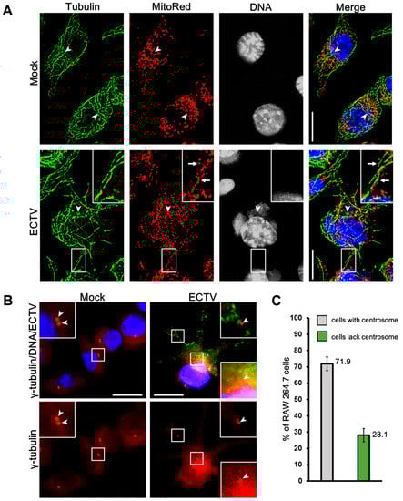 Tubulin cytoskeleton in RAW 264.7 cells at 18 hpi with ECTV. (A) α-tubulin staining. (B) γ-tubulin staining. (C) Percentage of virus-infected cells that show the centrosome or not. Arrowheads indicate microtubule organizing center (MTOC) with lack of mitochondria in mock cell or disappearance of MTOC that was replaced with viral factory and mitochondria in virus-infected cells (A) or centrioles (B). Arrows indicate punctate mitochondria on microtubules in mock-infected cells (A). Data from three independent experiments are presented as mean ± SD (n = 100 cells). Scale bar: 10 µm.