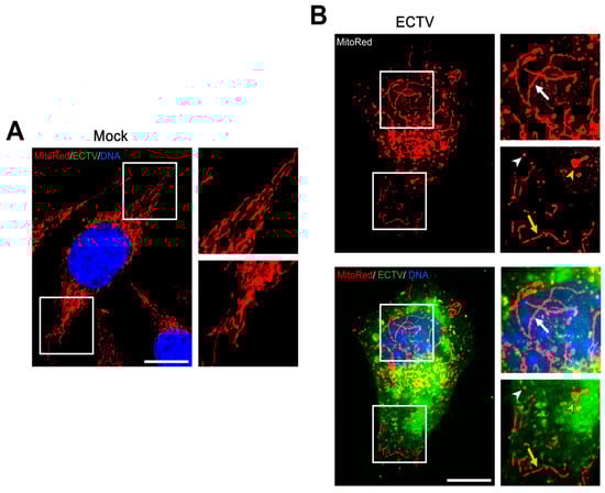 In our study, we focused on ectromelia virus (ECTV), the causative agent of mousepox. The virus belongs to the Poxviridae family and Orthopoxvirus genus that also includes variola virus (VARV, the causative agent of smallpox) and vaccinia virus (VACV). ECTV is closely related to VARV because of the narrow host range and similar disease symptoms; however, it does not pose a risk to human health. Therefore, ECTV has been used repeatedly as a model for investigating pathogenesis of orthopoxvirus infections [18]. Many studies have revealed that orthopoxviruses affect mitochondrial-mediated apoptosis [19,20,21]. However, little is known about the impact of orthopoxviral infection on the morphology and physiology of mitochondria.