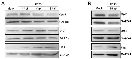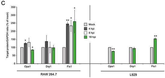 Level of mitochondrial fusion (optic atrophy protein 1, Opa1) and fission (dynamin-related protein 1, Drp1, and fission protein 1, Fis1) proteins in RAW 264.7 and L929 cells during ECTV infection. Representative Western blots of Opa1, Drp1, and Fis1 at 4, 8, 18 hpi in RAW 264.7 macrophages (A) and at 18 hpi in L929 fibroblasts (B). (C) Densitometry analysis of Opa1, Drp1, and Fis1 at 4, 8, 18 hpi in RAW 264.7 cells and at 18 hpi in L929 cells. The level of each protein was normalized to glyceraldehyde-3-phosphate dehydrogenase (GAPDH). Data from three independent experiments are presented as mean ± SD. Student’s t-test; * p ≤ 0.05; ** p ≤ 0.01.