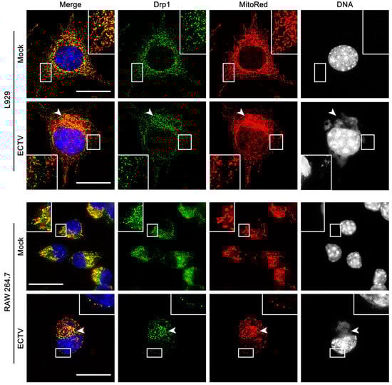 Distribution of Drp1 protein in L929 and RAW 264.7 cells at 18 hpi with ECTV. Mock-infected cells show regular distribution of Drp1. Arrowheads indicate accumulation of Drp1 in close association with viral factories that corresponds to the distribution of mitochondria. Scale bar: 10 µm.