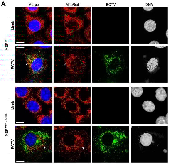 L929 murine fibroblasts (ATCC CCL1) were maintained according to the protocol previously described in [25]. The murine macrophages RAW 264.7 (ATCC TIB-71) were cultured in RPMI 1640-GlutaMAX medium (Gibco, Waltham, MA, USA) supplemented with 10% FBS and 1% antibiotic solution containing 100 U/mL penicillin and 100 µg/mL streptomycin (Sigma-Aldrich, Saint Louis, MO, USA) at 37 °C, with 5% CO2 in a humidified incubator. Wild-type murine embryonic fibroblasts (MEFsWT; ATCC CRL-2991) and Mfn1- and Mfn2-deficient MEFs (MEFsMfn1−/−/Mfn2−/−) (ATCC CRL-2994) were maintained in DMEM with 4.5 g/L glucose and 4.0 mM l-glutamine supplemented with 10% FBS and 1% antibiotic–antimycotic solution containing 100 U/mL penicillin, 100 µg/mL streptomycin, and 0.25 µg/mL amphotericin B at 37 °C, with 5% CO2 in a humidified incubator. L929, RAW 264.7, MEFsWT, MEFsMfn1−/−/Mfn2−/− and Vero cell lines are permissive to ECTV infection.