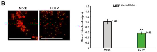 Hyperfragmentation of mitochondria in mouse embryonic fibroblast MEFMfn1−/−/Mfn2−/− cells at 18 hpi with ECTV. (A) Arrowheads indicate accumulation of mitochondria around viral factories in MEFWT and MEFMfn1−/−/Mfn2−/− cells. (B) The mean size of mitochondria in mock- and ECTV-infected MEFMfn1−/−/Mfn2−/− cells. Data from three independent experiments are presented as mean ± SD (n = 100 mitochondria/cell, 50 cells were analyzed). Student’s t-test; ** p ≤ 0.01. Scale bar: 10 µm (A,B).