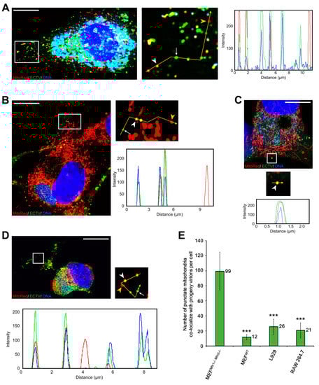 Co-localization of punctate mitochondria with ECTV progeny virions in MEF Mfn1−/−/Mfn2−/− (A), MEFWT (B), L929 (C), and RAW 264.7 cells (D) at 18 hpi. The fluorescence intensity of mitochondria (red line), ECTV antigens (green line), and viral DNA (blue line) was measured along the yellow segmented arrows (A–D). White arrowheads indicate punctate mitochondria co-localized with virions; white arrows indicate virions alone; yellow arrowheads indicate mitochondria alone (A–D). (E) The mean number of punctate mitochondria co-localized with ECTV progeny virions in MEF Mfn1−/−/Mfn2−/−, MEFWT, L929, and RAW 264.7 cells. Data from three independent experiments are presented as mean ± SD (n = 20 cells). Student’s t-test; *** p ≤ 0.001. Scale bar: 10 µm (A–D).