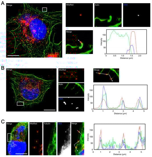 Punctate mitochondria co-localized with progeny virions interact with the cytoskeletal elements in ECTV-infected cells. (A) Mitochondrion co-localized with virion present on the top of the actin tail in MEFMfn1−/−/Mfn2−/− cells at 18 hpi. (B) Mitochondria co-localized with virions present on filopodia in L929 cells at 18 hpi. (C) Mitochondria co-localized with virions present on microtubules in L929 cells at 18 hpi. The fluorescence intensity of mitochondria (red line), actin (A,B) or tubulin (C) (green line), and viral DNA (blue line) was measured along the white segmented arrows. Scale bar: 10 µm (A–C).