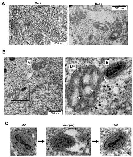 ECTV-infection alters mitochondrial structure in permissive cells. (A) Transmission electron micrograph showing mitochondria in control and ECTV-infected L929 cells. (B) Interaction between mitochondrion and virion via membrane bridge in L929 cells at 18 hpi. Arrow indicates membrane bridge. Arrowheads indicate swollen mitochondrial matrix. (C) Types of intracellular ECTV virions observed in RAW 264.7 cells at 18 hpi. E—ECTV virion; M—mitochondrion; M*—swollen mitochondrion; MV—mature virion; WV—wrapped virion. Scale bar: 500 nm.