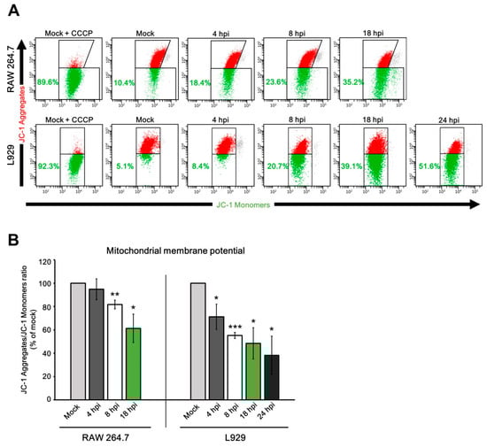 Mitochondrial membrane potential (MMP) in RAW 264.7 and L929 cells during ECTV infection. (A) Representative double fluorescence dot plots of flow cytometry analysis of 5,5′,6,6′-tetrachloro-1,1′,3,3′-tetraethylbenzimidazol-carbocyanine iodide (JC-1) staining in RAW 264.7 and L929 cells during ECTV infection. Red populations indicate cells with high MMP. Green populations indicate cells with depolarized MMP. (B) Mean JC-1 Aggregates/JC-1 Monomers ratio at 4, 8, and 18 hpi in RAW 264.7 macrophages and at 4, 8, 18, and 24 hpi in L929 fibroblasts. Data from three independent experiments are presented as mean ± SD (n = 10,000 cells). Student’s t-test; * p ≤ 0.05; ** p ≤ 0.01; *** p ≤ 0.001.