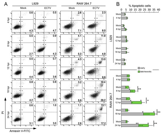 Apoptotic rate in RAW 264.7 and L929 cells during ECTV infection. (A) Representative double fluorescence dot plots of flow cytometry analysis of Anexin V- fluorescein isothiocyanate (FITC) and propidium iodide (PI) staining in RAW 264.7 and L929 cells at 4, 8, 12, 18, 24 hpi with ECTV. (B) The percentage of early and late apoptotic or necrotic cells. Student’s t-test; * p < 0.05, ** p < 0.01.