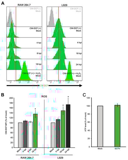 Level of reactive oxygen species (ROS) and ATP in RAW 264.7 and/or L929 cells during ECTV infection. (A) Representative histograms of flow cytometry analysis of 5-(6)-chloromethyl-2′,7′-dichlorofluorescein (CM-DCF) staining in RAW 264.7 and L929 cells during ECTV infection. Grey populations indicate no-stain mock cells. Mock cells stained with CM-DCF were used as a negative control. Mock cells treated with H2O2 and stained with CM-DCF were used as a positive control. (B) Mean fluorescence intensity (MFI) of CM-DCF at 4, 8, and 18 hpi in RAW 264.7 macrophages and at 4, 18, and 24 hpi in L929 fibroblasts. Data from three independent experiments are presented as mean ± SD (n = 10,000 cells). Student’s t-test; * p ≤ 0.05. (C) Level of ATP in control and ECTV-infected L929 fibroblasts at 18 hpi.