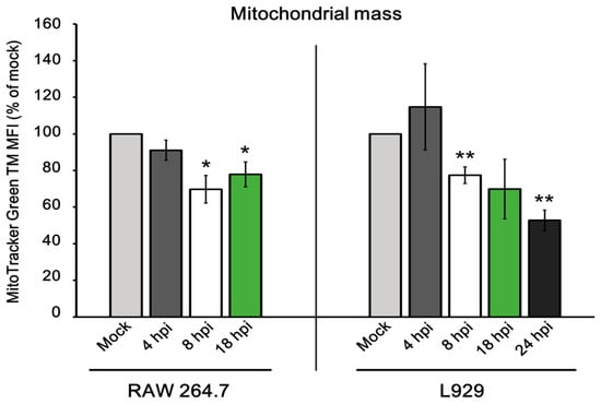 Mitochondrial mass in RAW 264.7 and L929 cells during ECTV infection. Mean fluorescence intensity (MFI) of MitoTracker Green TM at 4, 8, and 18 hpi in RAW 264.7 macrophages and at 4, 8, 18, and 24 hpi in L929 fibroblasts. Data from three independent experiments are presented as mean ± SD (n = 10,000 cells). Student’s t-test; * p ≤ 0.05; ** p ≤ 0.01.