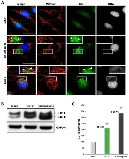 ECTV induces autophagy in later stages of infection in L929 fibroblasts. Uninfected cells pretreated with 30 µM chloroquine for 16 h were used as a positive control. (A) The microtubule-associated light chain 3B (LC3B) staining; (B) representative Western blots of LC3B at 18 hpi; (C) densitometry analysis of LC3 II at 18 hpi. The level of protein was normalized to GAPDH. Data from three independent experiments are presented as mean ± SD. Student’s t-test; ** p ≤ 0.01. Scale bar: 20 µm (A).