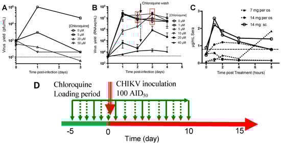 To confirm that plasma concentrations can reach the inhibitory concentration range shown in the in vitro studies (Figure 1A,B), three groups of two NHPs were given chloroquine either orally (7 and 14 mg/kg) or subcutaneously (14 mg/kg) for five consecutive days. On day 5 post-treatment evaluation of chloroquine uptake kinetics was done with Cmin that was obtained just before the 6th treatment (time 0 on Figure 1C). As shown, the route of treatment influenced plasma concentration kinetics (Figure 1C). Orally treated NHPs had a chloroquine plasma concentration below the expected inhibitory concentrations and large variation of curve evolution, whereas subcutaneous administration gave similar drug plasma concentrations in the two macaques, with a mean Cmax of 5.16 µM at 1 h post-treatment, a Cmin of 1.8 µM (after five days of treatment, dotted line, Figure 1C). These concentrations are very similar to those reported for malaria patients [] and to the IC50 obtained for CHIKV-infected Vero E6 cells [,]. No hepatic toxicity was observed, with plasma levels of AST and ALT remaining in the normal range of 28–58 IU and 17–40 IU/mL, respectively. As such, chloroquine was subsequently delivered subcutaneously to the macaques for downstream studies.