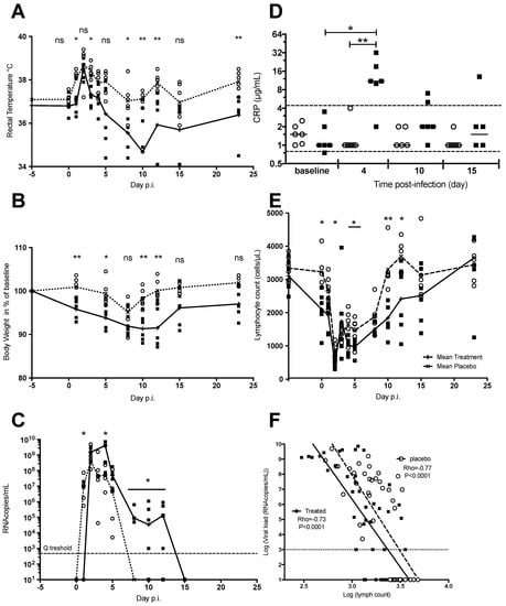 Exacerbation of acute chikungunya in macaques that were treated with chloroquine. Macaques randomly assigned to the placebo (n = 6, open circles, median shown as a dotted line) or chloroquine (n = 6, closed squares, median shown as a solid line) groups were treated for five days before infection with CHIKV. Treatment was then continued for 10 days. (A) Fever and hypothermia, as determined by measurements of rectal temperature; (B) Body weight loss in treated animals (percentage of baseline); (C) Plasma viral load, as measured by RT-qPCR; (D) CRP determination in plasma (* p < 0.05 Wilcoxon rank test). Global analysis by Kruskal-Wallis test, p = 0.0144 for the chloroquine group, not significant for the placebo group. The two dotted lines indicate the normal range of plasma CRP levels that were obtained from 15 healthy macaques; (E) Lymphopenia, as assessed by lymphocyte count kinetics; (F) Absolute lymphocyte counts are correlated with plasma viral load during acute chikungunya (Spearman’s rank correlation test). Mann & Whitney test when comparing placebo and treated animals; ns: not significant. * p < 0.05; ** p < 0.01. Wilcoxon rank test p values, for comparing the data at a given time point with baseline values (before treatment), are given in the text. Dotted horizontal line in C and F are the lower limit of quantitation by Q-RT-PCR.