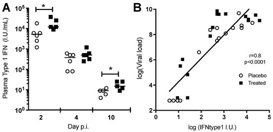 The type 1 interferon response and plasma viral load during acute chikungunya. (A) Type 1 interferon concentration was higher in the chloroquine group (black squares) than in the placebo group (open circles) on day 2 pi (viral load peak) and day 10 pi (during clearance). * p < 0.05, Mann & Whitney test; (B) Type 1 interferon concentration is correlated with plasma viral load during acute chikungunya (Spearman’s rank test, rho = 0.8, p < 0.0001).