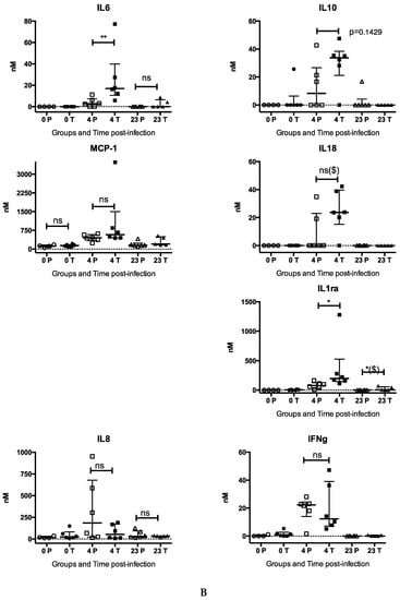 Evaluation of plasma inflammatory mediators in chloroquine treated (T, black symbols) versus non-treated (Placebo, P, open symbols) animals before infection (0P, 0T), and at 4, 23 days post-infection. Macaques were treated with chloroquine five days, and then were inoculated with 100 AID50 of CHIKV (day 0). Plasma grow-factor, cytokines and chemokines induced by the CHIKV infection were assayed using Luminex assays at day 0 before infection, four days post infection, and at day 23 post-infection thus 13 days after resolution of chloroquine treatment (see material and methods). (A) Chloroquine treatment induced variation in the expressed cytokines and chemokines: GM-CSF, IL-15, G-CSF, IL-12/23 (p40), and VEGF. Kruskal-Wallis then M&W test, ** p < 0.01, ns: not significant; (B) Cytokines significantly increased after infection (all p < 0.001: IL-6, MCP-1, IL-8, IL-10, IL-18, IL-1RA, IFNγ; in chloroquine treated (dark symbols) versus non-treated (open symbols) animals. Comparison between groups: Kruskal-Wallis then M&W test, ** p < 0.01, * p < 0.05; $ p < 0.07, ns: not significant.