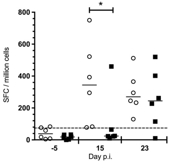 Adaptive immunity to acute CHIKV infection develops rapidly in both humans and animals [,,,]. We used IFN-γ ELISPOT assay as a robust indicator of virus-specific cell-mediated immunity. IFN-γ was detected in the placebo group at 15 dpi, whereas only one of the six treated macaques displayed a specific response at this time (Figure 5, p < 0.05 M&W).