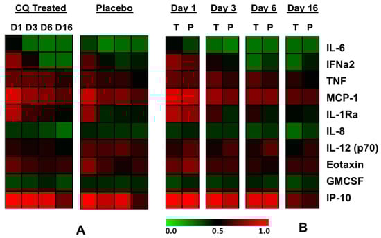 Heatmap of cytokines measured in each group. (A) General Comparison of chloroquine (CQ) treated vs Placebo treated groups (B) Comparing chloroquine treated (T) vs. Placebo treated (P) groups at each specific day. Heatplots are shown (top down) from the lower quantities (green) to higher quantities (red).