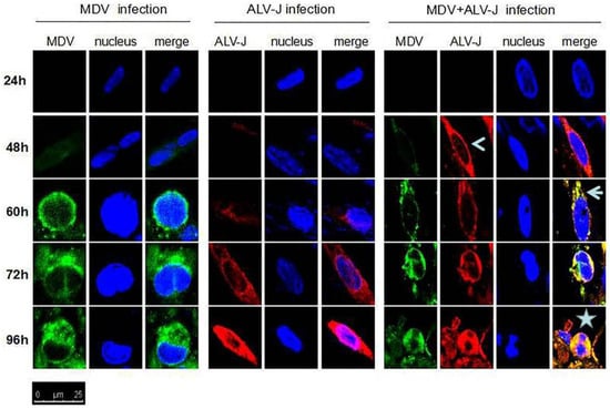 Zhou, J.; Zhao, G.-L.; Wang, X.-M.; Du, X.-S.; Su, S.; Li, C.-G.; Nair, V.; Yao, Y.-X.; Cheng, Z.-Q. Synergistic Viral Replication of Marek’s Disease Virus and Avian Leukosis Virus Subgroup J is Responsible for the Enhanced Pathogenicity in the Superinfection of Chickens. Viruses 2018, 10, 271. https://doi.org/10.3390/v10050271