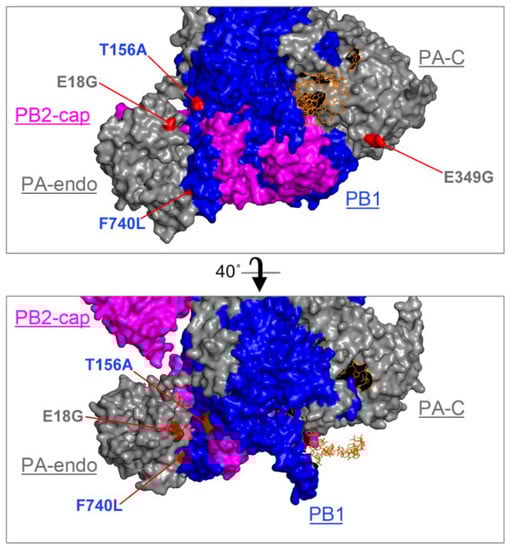 In addition to mutations in HA, we identified four missense mutations in viral polymerase subunits PA and PB1 that exceeded 25% of the population, which we investigated further. In the PA segment, two mutations that resulted in E18G and E349G amino acid substitutions, respectively, reached over 99% in read frequency (Figure 2). In the PB1 segment, two additional substitutions at 36% and 50% frequency resulted in T156A and F740L amino acid substitutions, respectively. We mapped these substitutions onto the only available 3D crystal structure of the IAV polymerase ternary complex from a bat influenza A virus []. Despite being separated in the primary sequence, in the 3D structure model, the two PB1 substitutions are in close proximity to each other and the PA interface (Figure 3). The F740L mutation lies within the C-terminal PB2-interacting region of PB1; in the crystal structure, this residue makes direct contact with the PA subunit. Our deep sequencing protocol is limited to generating short ~100–300 bp reads, which prevents us from assigning groups of mutations to a particular genome variant. For this reason, we do not know whether mutations present at <50% frequencies occur in the same molecule, including the F740L and T156A substitutions on PB1. By contrast, the two mutations in PA that reached over 99% abundance must both be present in the majority of genome segments. Interestingly, the PA mutation E18G is located in the amino-terminal endonuclease domain of PA and resides close to PB1 T156A in the 3D structure. The surface-exposed PA E349G substitution is located on the opposite side of the polymerase complex (Figure 3).