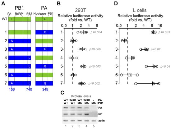 In addition to changes in receptor binding specificity, adaptive mutations in IAV are often located within RNA polymerase segments []. In our study, we did not identify adaptive changes in the PB2 gene. At the same time, we observed the emergence of an E349G substitution in PA that reached over 99% read frequency, and two substitutions in PB1: F740L at 49.8% and T156A at 36.3% (Figure 2). We focused our subsequent analyses on these mutations in the RdRp complex to investigate their contribution to mouse adaptation. In the reconstituted viral minireplicon assay, only the PA E349G substitution led to a significant increase in RNA polymerase activity compared to the wild-type (Figure 4). This mutation has been previously identified after sequential passaging of both A/Puerto Rico/8/34 (H1N1) and (A/chicken/Hubei/01/1999) (H9N2) viruses in mice [,], and Rolling et al., showed that PA E349G contributed to enhanced polymerase activity and increased titres in the mouse lung following the generation of a recombinant PR8 virus bearing this mutation []. This suggests that PA E349G is a marker of mouse adaptation because it dramatically increases minireplicon activity in mouse cells, while the increase in minireplicon activity in human cells is more modest (Figure 4). PA amino acid 349 resides in a domain that was shown to be responsible for viral RdRp association with the host RNA polymerase II through binding to its C-terminal domain []. Because mouse and human RNA polymerase II C-terminal domain repeats are identical, it is unclear how position 349 in PA contributes to the enhanced RdRp activity in mouse cells.
