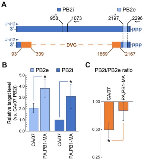 Using reverse genetics, we introduced PA and PB1 mutations into the parental CA/07 virus and created the CA/07-PA,PB1-MA virus that differs from the CA/07-MA in that all segments except for PA and PB1, which are identical to the parental strain. Compared to the CA/07 virus, which replicated poorly in MEFs, the CA/07-PA,PB1-MA virus replicated to 10-fold higher titers and produced higher levels of genomic RNA at 18 hpi (Figure 5). Most importantly, infection of MEFs with CA/07-PA,PB1-MA at a low MOI resulted in the generation of much lower levels of DVGs compared to the parental strain (Figure 6). IAV DVGs retain the 5′ and 3′ ends of the full-length genome segment, but contain large internal deletions ranging from 180–1000 bp []. These deletions occur during replication when the viral polymerase falls off the (+)-sense cRNA template and reattaches a location further downstream [,]. Recently, DVGs were detected in specimens collected directly from influenza patients, and their abundance was associated with better clinical outcomes [].