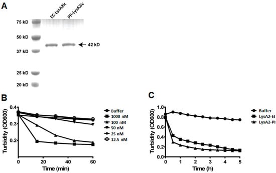 A previous study was unable to get S. cerevisiae to secrete LysA2 []. Consequently, we wanted to explore LysA2 expression, both intracellular and secreted, in P. pastoris, which is a eukaryotic model system for heterologous expression of proteins. To compare the activity of LysA2 produced by yeast with the activity of LysA2 from the Escherichia coli BL21 (DE3) expression system used by Ribelles et al. [], Pichia pastoris GS115 was employed. Intracellularly expressed His6-tagged LysA2 proteins from P. pastoris and E. coli were purified. SDS-PAGE analysis revealed both LysA2 protein bands were the predicted size, approximately 42 kDa (Figure 1A), with no apparent glycosylation of the yeast expressed protein.