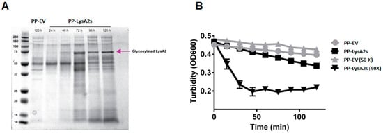 Activity of supernatant containing secreted LysA2 from P. pastoris. Secreted LysA2 from P. pastoris (PP-LysA2s) was confirmed by SDS-PAGE analysis of the supernatant. The LysA2 in the supernatant increased with increased incubation time. The molecular weight (~72 kDa) was larger than the expected size (42 kDa) which could be due to glycosylation (A). Lytic activity was confirmed by turbidity reduction with L. casei treated with concentrated (50×) and unconcentrated culture supernatant from the P. pastoris secreting LysA2 strain (PP-LysA2s) compared to the culture supernatant from the P. pastoris with the empty vector strain (PP-EV) (B).