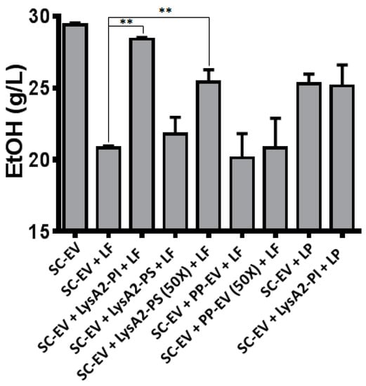 3.4. S. cerevisiae Secreting LysA2 Restores Ethanol Yield in Mock Contamination of Fermentation