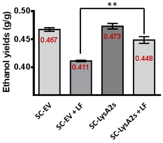 S. cerevisiae containing the LysA2 secreting plasmid (SC-LysA2s), and the same strain with the vector lacking the LysA2 gene (SC-EV), were employed to test whether or not secreted LysA2 directly from S. cerevisiae can prevent contamination (Table 3). The fermentation profiles of both S. cerevisiae strains were similar when LF was not added. In the presence of LF, The LysA2 secreting S. cerevisiae strain fermented glucose and produced almost 29% more ethanol than the S. cerevisiae strain with the empty vector. It is likely that the S. cerevisiae strain with the empty vector failed to finish the fermentation due to inhibition by LF. With LF, the lactic acid concentrations in the culture medium were higher than the culture medium with the LysA2 secreting S. cerevisiae. As expected, the LysA2 secreting S. cerevisiae consumed glucose more rapidly, and increased ethanol yield by approximately 9%, while ethanol yield of the empty vector S. cerevisiae strain decreased in the presence of LF (Figure 4).