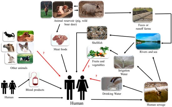 As a consequence of the high seroprevalence of HEV in industrialized countries, many questions arise about whether the consumption of contaminated pork is the unique source of infection. There is a growing interest for addressing alternative routes of infection linked with water, other animals, vertical transmission, and transfusion. Figure 4 summarizes all of the transmission pathways described or suspected in the literature.