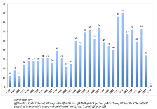 Given that injection drug users dominated the HIV epidemic in Spain during the first two decades [4], the high rate of viral hepatitis B, C, and delta in this group requested and attracted much attention [59,60,61]. This is contrast with conditions such as Kaposi’s sarcoma, linked to gay men, that are less common and that demanded less attention. Figure 2 records the yearly number of publications recorded in PubMed on HIV-hepatitis coinfection by Spanish authors.