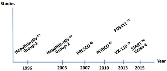 - Sulkowski, M.; Pol, S.; Mallolas, J.; Fainboim, H.; Cooper, C.; Slim, J.; Rivero, A.; Mak, C.; Thompson, S.; Howe, A.; et al. Boceprevir versus placebo with pegylated interferon alfa-2b and ribavirin for treatment of hepatitis C virus genotype 1 in patients with HIV: A randomised, double-blind, controlled phase 2 trial. Lancet Infect. Dis. 2013, 13, 597–605. [Google Scholar] [CrossRef]