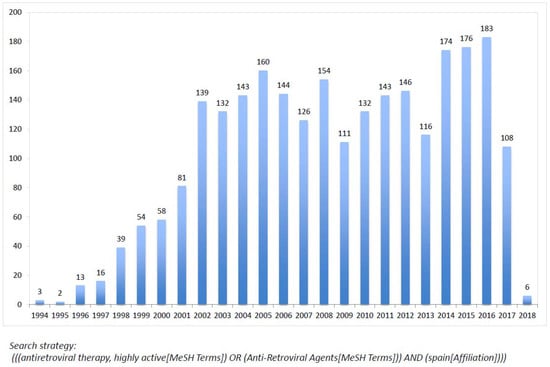 Number of publications on HIV/AIDS recorded yearly in PubMed by Spanish authors.