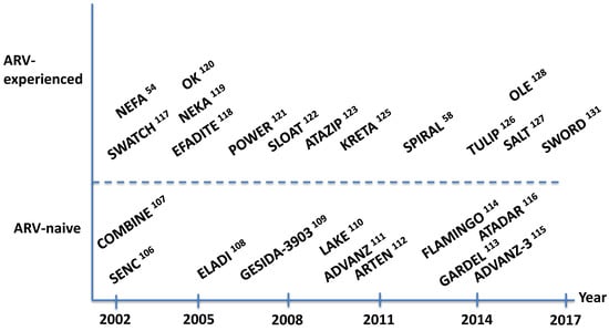 - Cahn, P.; Andrade-Villanueva, J.; Arribas, J.R.; Gatell, J.M.; Lama, J.R.; Norton, M.; Patterson, P.; Sierra Madero, J.; Sued, O.; Figueroa, M.I.; et al. Dual therapy with lopinavir and ritonavir plus lamivudine versus triple therapy with lopinavir and ritonavir plus two nucleoside reverse transcriptase inhibitors in antiretroviral-therapy-naive adults with HIV-1 infection: 48 week results of the randomised, open label, non-inferiority GARDEL trial. Lancet Infect. Dis. 2014, 14, 572–580. [Google Scholar] [PubMed]