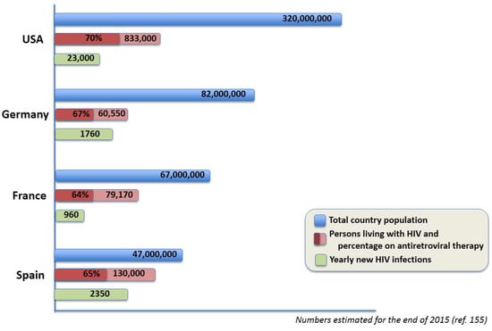 In particular, there is a need to revisit preventive strategies. It is remarkable that HIV incidence in Spain is still one of the largest in Western Europe [153]. The number of new HIV diagnoses per year is roughly 2.5-fold compared to France or 1.5-fold compared to Germany, despite having larger populations and similar rates of antiretroviral coverage for their HIV patients (Figure 6). Given that more than 80% of new HIV infections in Spain are occurring in MSM, mostly young native Spaniards, re-thinking education and behavioral interventions seems mandatory [3].