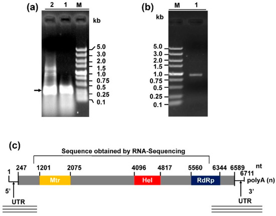 | Family | Virus Name | Abbr. | NCBI Accession Number | Mtr (Identity %) | Hel (Identity %) | RdRp (Identity %) |