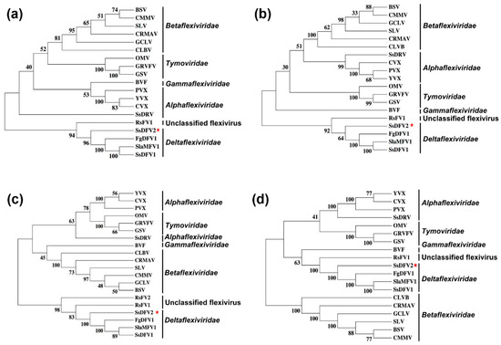 3.3. SsDFV2 is Closely Phylogenetically Related to Flexiviruses