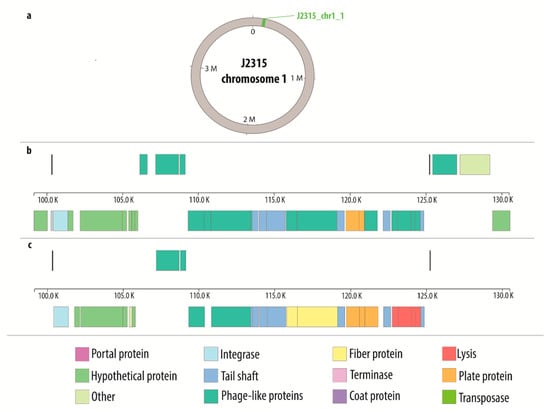 Comparative map of J2315_chr1_1 phage region: (a) general location of the phage on the host chromosome; (b) genes characterization based on PHASTER annotation; (c) genes characterization based on manual annotation.