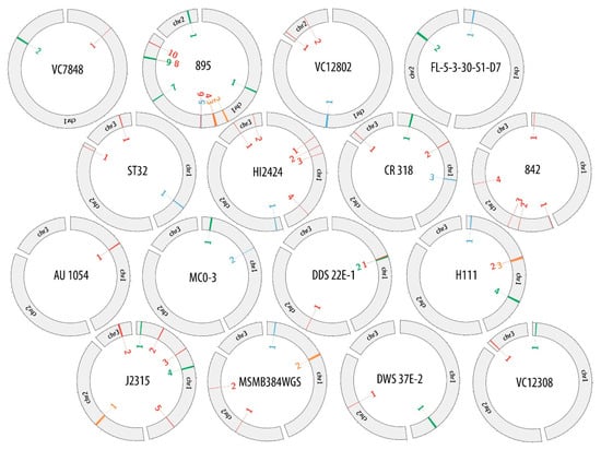 Supplementary data (Tables S1–S16) were used to create the comparative maps (Figures S1–S16) depicting the constitution of each prophage genome. Figure 1 presents the comparative map of J2315_chr1_1 phage region, while the remaining maps are shown in Supplementary Materials (Figures S1–S16). Each image shows two variants of phage genome annotation and approximate location of prophage in the host chromosome. Most crucial genes with determined function are colored likewise on both annotation versions to provide further simplification of compared methods. Based on the results gathered in the Table 2, the genome maps depicting the location of identified regions was created with Circos (Figure 2).