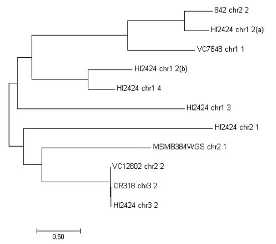 The MFS transporters are the largest known superfamily of secondary carriers []. A considerable amount of drug and multidrug efflux pumps found in bacteria are comprised of the MFS transporters class. They are found in both Gram-negative (e.g., enterobacteria, Pseudomonas sp. or Moraxella sp.) and Gram-positive strains (Staphylococcus sp., Bacillus sp.), however it is unclear if they share substrate profiles []. The MFS found in strains examined have been phylogenetically compared to each other (Figure 3). Although, MFS proteins occur six times in the analyzed regions of HI2424, they differ significantly. There is however high similarity between MFS transporters found in VC12802_chr2_2, CR318_chr3_2 and HI2424_chr3_2 (undelined in Table 4).
