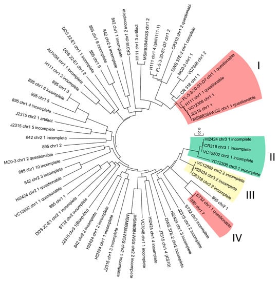 In an attempt to differentiate taxonomical groups of analyzed prophages, a phylogenetic analysis was conducted. The evolutionary resemblance of 64 nucleotide phage-like sequences (intact, artifact, questionable, incomplete) were proposed by using the maximum likelihood method based on the Tamura-Nei model []. The tree with the highest log likelihood (−108,132.8877) is presented in Figure 4. The tree is drawn to scale, with branch lengths measured in the number of substitutions per site.