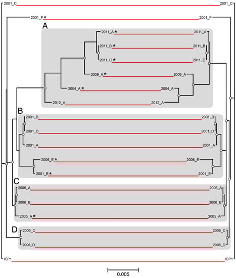 ICP1 genomes were analyzed from isolates that were collected over a 12-year period, from 2001 to 2012 (Table 1). The isolates were derived from both environmental water samples and patient stool samples that were collected in Bangladesh (n = 18) and India (ICP1_2012_A). Genome length was slightly variable with an average of 126,384 bp (stdev: 3008 bp). The maximum likelihood phylogenetic analysis grouped both of the whole-genome and core-genome alignments into several general clusters (Figure 1). Cluster A contains the five most recently isolated strains, as well as ICP1_2004_A. This cluster also contains five of the seven total CRISPR-positive strains in the dataset. Cluster B contains four of the six 2001 isolates, ICP1_2006_E, and two of the CRISPR-positive strains. Clusters C and D contain isolates from the intermediate years of 2005 and 2006, and one CRISPR-positive is represented in cluster C. The CRISPR-positive strain ICP1_2001_F did not cluster with other isolates. ICP1 ancestral and ICP1_2001C also cluster closely together, however they are not specifically highlighted.
