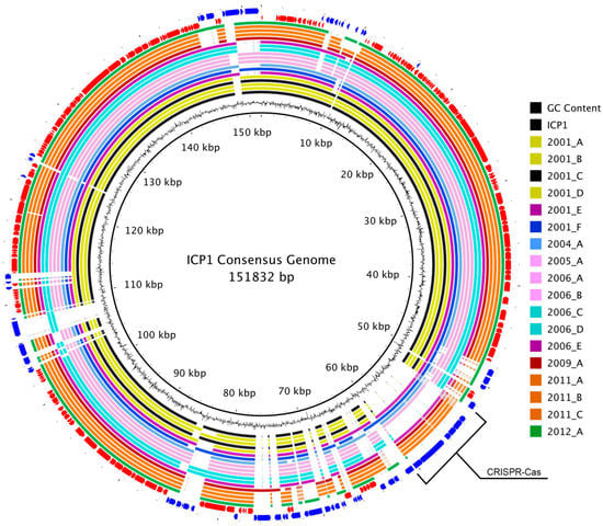 ICP1 pan-genome consensus alignment. A BLASTn-based whole genome alignment of all 19 ICP1 phage genomes using the MAUVE alignment consensus sequence as a reference. The innermost ring is the consensus sequence. The next ring represents the GC content for that region. The following 19 rings display the alignment for each genome and are colored by phylogenetic similarity as determined by the analysis of whole genomes (Figure 1, left). The second to last ring (red) represents the core-genomic ORFs, while the outermost ring (blue) is the accessory-genome ORFs. The CRISPR-Cas insertion region is labeled.