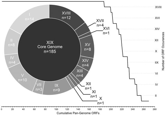 To estimate gene diversity among the genomes, we divided the total pan-genomic ORF complement into core and accessory groups. The core ORFs—those that were found in all 19 genomes—comprised ~70% of the total number of ORFs (185 out of 269), while the other 84 ORFs were considered to be accessory (Figure 3).