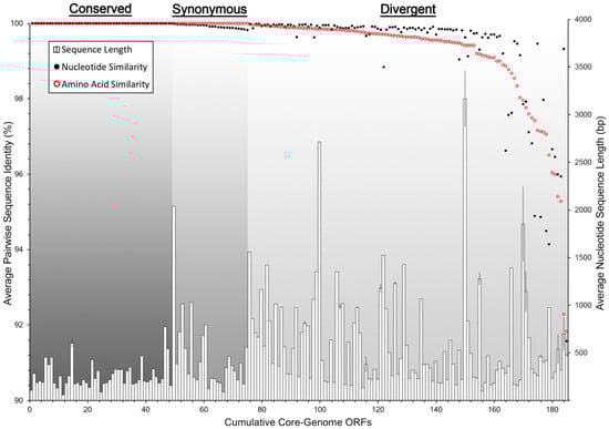 ICP1 core-genome ORF divergence. All ICP1 core-genome ORFs are arranged by the average pairwise similarity (171 pairwise comparisons) of both DNA nucleotide sequence alignments (black dots) and amino acid residue alignments (red circles). The histogram shows the average nucleotide sequence length and the standard deviation among the 19 sequences per ORF. The graph is divided into three sections by types of ORF similarity: Conserved (identical nucleotide and amino acid sequences), Synonymous (identical amino acid sequences, but silent nucleotide mutations), and Divergent (dissimilarity in both nucleotide and amino acid sequences).