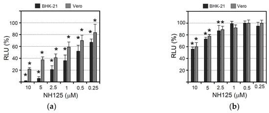 In order to determine whether NH125 would show inhibitory activity if the cells were treated before, but not during or after virus infection, Vero and BHK-21 cells were incubated for 1 h with NH125 and then inoculated for 1 h (in the absence of NH125) with VSV*∆G(sNLuc), a propagation-defective G gene-deleted VSV expressing secreted NanoLuc luciferase (sNLuc). Subsequently, the cells were incubated with medium containing a VSV-neutralizing antibody in order to limit the virus entry phase to 1 h. The activity of the sNLuc reporter protein secreted into the cell culture medium was determined at 6 h post infection. It turned out that NH125 suppressed reporter activity in a concentration-dependent manner in both Vero and BHK-21 cells (Figure 2a). The most pronounced effect was found with 10 µM of NH125 which led to a twenty-fold (95%) reduction of sNLuc activity. The IC50 values for NH125-mediated inhibition of infection of BHK-21 and Vero cells were about 0.5 µM and 1 to 2.5 µM, respectively, indicating that BHK-21 cell are more sensitive to NH125 action than Vero cells. Our results also suggest that pretreatment of cells with NH125 is already sufficient to inhibit virus infection.