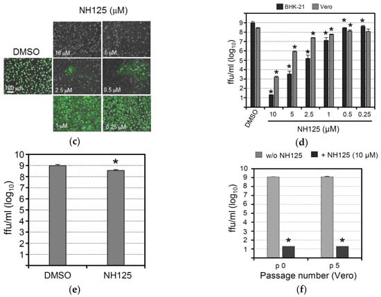 To figure out whether NH125 would directly affect the infectivity of virus particles, a VSV* suspension containing 108 infectious particles per mL was treated for 2 h at 37 °C with 10 µM of NH125. The virus was pelleted through a sucrose cushion to remove the drug titrated on BHK-21 cells. It turned out that NH125 reduced virus titers three-fold (Figure 2e), suggesting that the drug essentially exerts effects on the host cell rather than on the virus. VSV* remained fully sensitive to the action of NH125 even after five passages on Vero cells in the presence of 10 µM of NH125 (Figure 2f).
