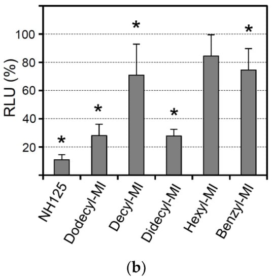 NH125 is an imidazolium derivative which is substituted at positions 1, 2, and 3 with a benzyl, methyl, and cetyl groups, respectively []. To see whether the substituents would be important for antiviral activity, related imidazolium compounds with different side groups were investigated (Figure 3a). When the cells were pretreated with 1-dodecyl-3-methylimidazolium iodide (Dodecyl-MI), infection with VSV*∆G(sNLuc) was reduced, although not to the same extent compared to NH125 (Figure 3b). The imidazolium derivative 1-decyl-3-methylimidazolium chloride (Decyl-MI) with a shorter aliphatic side chain (Figure 3b) was less active compared to Dodecyl-MI while 1,3-didecyl-2-methylimidazolium chloride (Didecyl-MI) containing two dodecyl side groups was as active as Dodecyl-MI. Imidazolium derivatives with either a shorter aliphatic side chain (1-hexyl-3-methylimidazolium iodide, Hexyl-MI) or without such a side group (1-benzyl-3-methylimidazolium chloride, Benzyl-MI) (Figure 3b) showed no, or low, antiviral activity. These findings suggested that NH125-related imidazolium derivatives may also exhibit antiviral activity, which critically depends on the length of the aliphatic side chain.